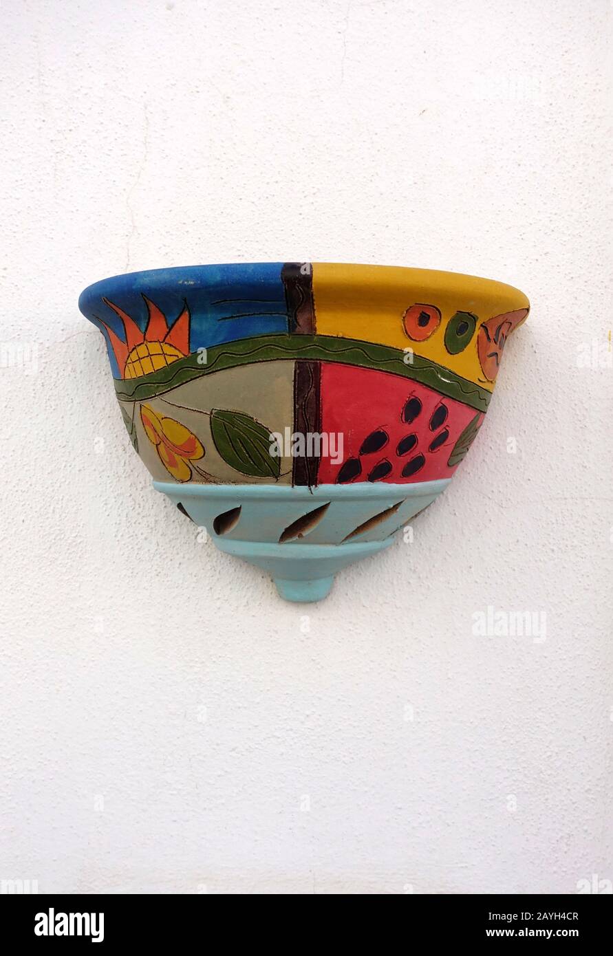 Portuguese Folk Art Wall Sconce Flower Planter On A Stucco Wall In